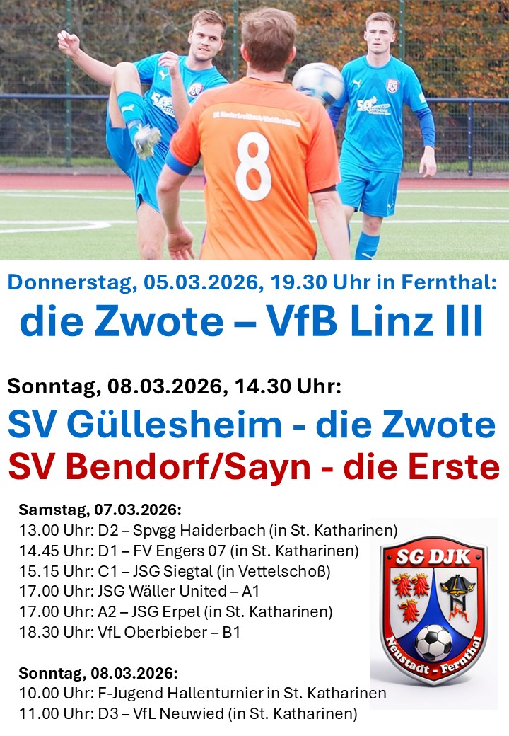 Trainingslager in den Osterferien für alle Jugendspieler zwischen 10 und 15 Jahren Im vergangenen Jahr fand bereits ein Trainingslager für Jugendspieler statt, das bei Spielern und Eltern großen Anklang fand und sehr erfolgreich verlief (s. Bericht zum Trainingslager 2025: https://www.sgdjk.de/1-trainingslager-der-djk-neustadt-fernthal/ ). Auf dieser positiven Erfahrung bauen wir auf und möchten den Kindern in diesem Jahr ein […] → Zum BeitragE1 der DJK überrascht im Pokal!
